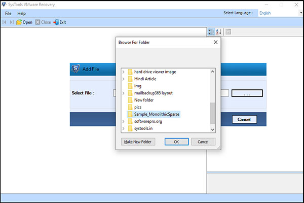 2、现在选择VMDK文件。从列表中选择VMDK文件后,单击“ 确定”按钮,您还可以创建新文件夹。