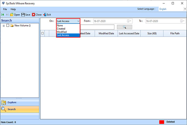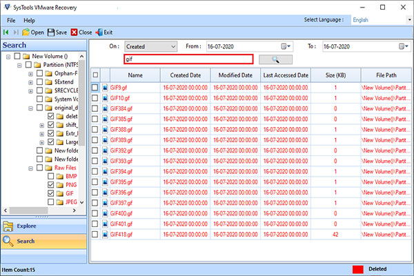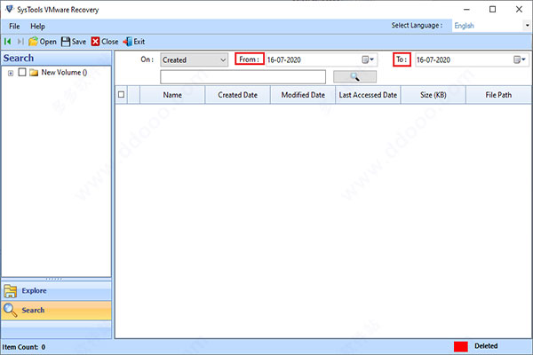 VMware Recovery软件允许您使用扩展名在VMDK文件中搜索任何特定文件。另外,您可以通过应用以下选项来过滤项目:文件创建日期,修改日期和最后访问日期。您可以设置日期范围,以过滤掉该特定日期范围内的所有项目。