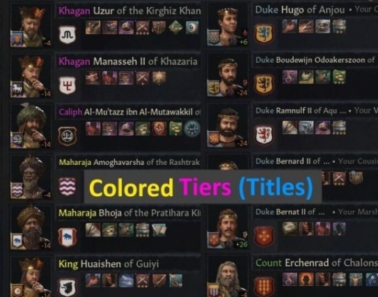 王国风云3彩色头衔MOD是专为喜欢十字军之王3游戏的玩家们准备的界面优化类mod,玩家使用补丁后能够直观的看到自己的人物头衔,从而可以快速选择自己需要人物属性,极大的节约了自己的时间,相信不少的玩家都会非常喜欢。