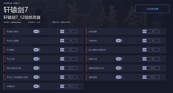 轩辕剑7修改器可以帮助想在游戏中获得更加畅快的游戏体验的玩家们实现多种开挂功能,支持修改的游戏参数包括无限生命、不会晕眩、快速斩杀、药品气力不减、收妖及药品无冷却等,总共有十三项,可以说非常非常实用了,相信你使用后就会喜欢上它的~