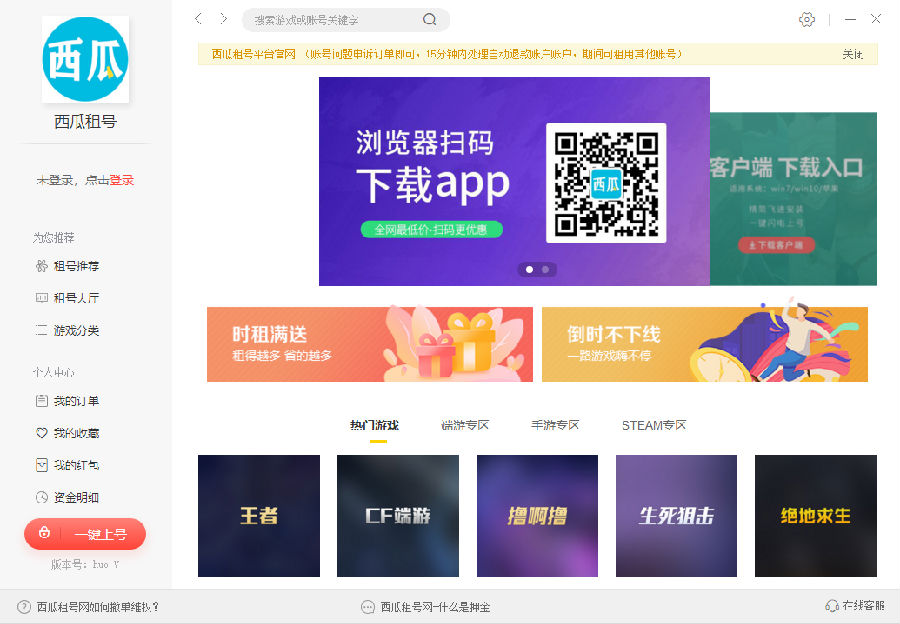 西瓜租号平台电脑客户端主要为各位游戏爱好者们提供完全优质的游戏账号租赁服务,玩家们能够在这里租到各种游戏的高级账号,而且价格也十分实惠,租手游账号会给账号和密码玩家自己登陆,端游则是直接一键上号,非常非常方便,也很安全,欢迎大家下载使用~