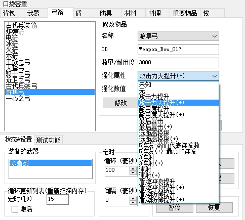弓箭、护盾、装甲、村料、食物、金币、背包容量、武器、实验、位置、技能都可以进行设置。