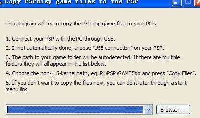 在电脑端安装文件跳出下图所示界面时,请使用USB线连接您的电脑和PSP主机,接着选择“Copy files”,程序会自动将软件PSPdisp安装到PSP中。