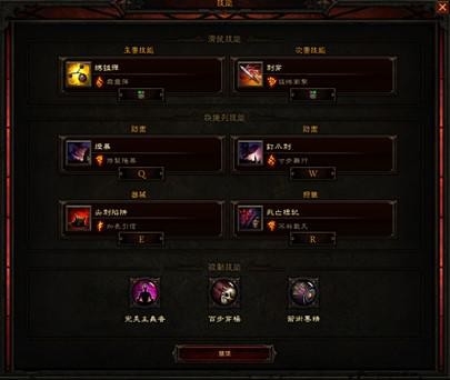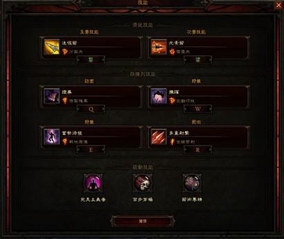 左键技能:积攒憎恨和几率控制。右键技能:刺穿技能符文使用昏迷的。1技能:隐身。十分有用,多一下瞬发技能。符文选择降低戒律消耗。2技能:跳跃。符文选择不消耗戒律但冷却cd15秒。3技能:蓄势待发 符文选择加血,等你拥有2行戒律时,开局BOSS上来爆发的一轮直接用隐身去抗住然后再用,又或者是憎恨和戒律都没有,即将躺地板的时候。4技能:死亡标记,增加伤害。