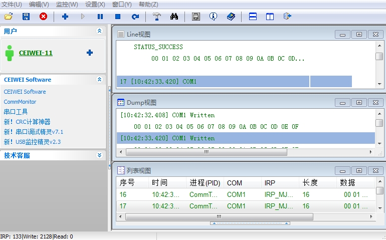 CEIWEI CommMonitor监控记录和分析系统中的所有串行端口活动;追踪应用程序或驱动程序开发,串行设备测试和优化等过程中可能出现的问题的理想工具。还提供过滤、搜索、数据导出和强大的数据拦截功能,可以将指定端口的数据流、控制流信息拦截并保存下来,供分析之用。如察看端口状态的变化(波特率、数据位、校验位、停止位),拦截上行、下行的数据,处理速度快,拦截效率高,并且可以16进制、10进制、8进制、2进制显示输出数据,字符串则可以不同的编码显示输出,全面支持设备数据的Unicode/UTF8/UTF7编码解码,支持Modbus协议分析解析。
