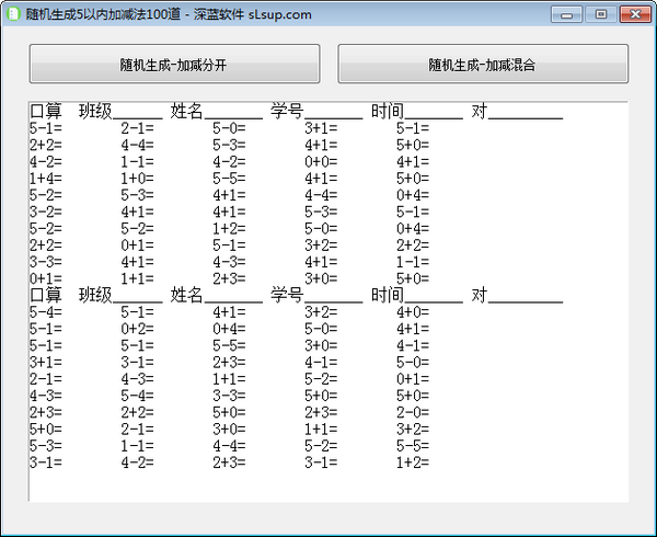 学校老师最近要求小学生多练习5以内的加减法,要求10分钟内做完100道题,因为要不断练习,手工出题的话很慢。随机一键生成一百道5以内的加减法题给小孩练习。程序增加了多处异常处理,比如,考虑到小学生不会用负数,减法时被减数不允许是0,被减数一定要大于减数。加法是相加一定要等于或者小5,不会超过5。
