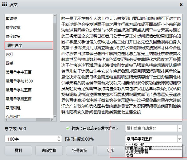 建议新手前期前选择 常用单字前五百 10字发文, 配合该功能使用 。