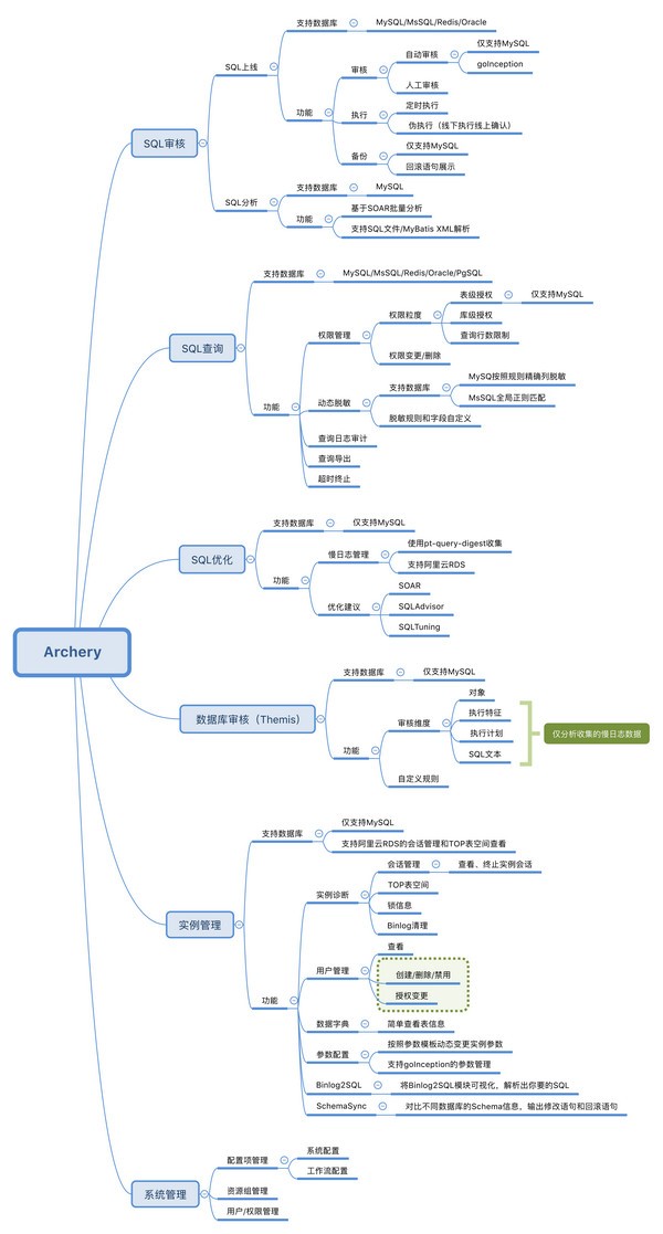 Archery 定位于 SQL 审核查询平台,目的在于提升 DBA 的工作效率,支持主流数据库的SQL上线和查询,同时提供丰富的MySQL运维功能,所有功能都兼容手机端操作,是archer的分支项目,支持工单、审核、定时任务、邮件、OSC等功能。