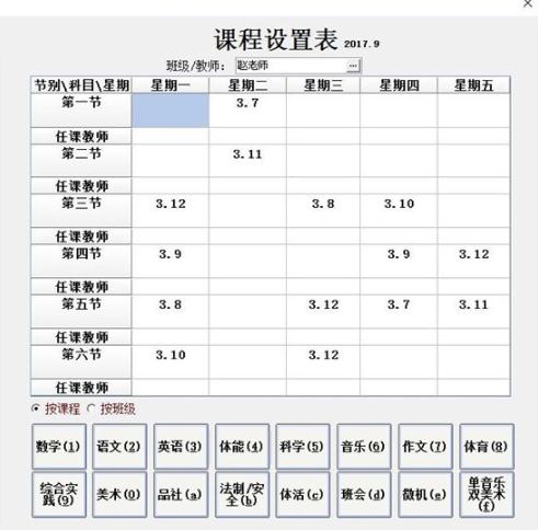 2、程序操作界面与实际课程表相同,通过点击“课程”按钮或者“班级”按钮直接将相应课程或班级添加至课程表,每次单击后自动切换到下一节次位置,简便高效。