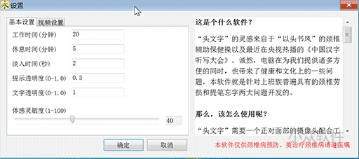 长期在电脑面前埋头苦干的用户需要更加重视自身的身体健康,尤其是颈椎问题,相信大部分小伙伴都没有定时活动头部缓解颈椎疲劳的意识,所以小编专门为大家带来了这款头文字定时提醒缓解颈部疲劳工具,可以定时提醒用户以“用头写米字”的方法来活动头部,软件会通过摄像头来进行监控,快来试试吧!