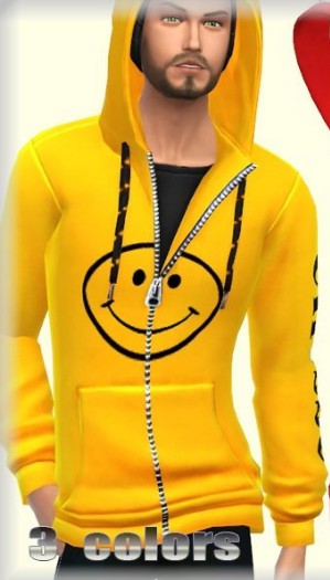 模拟人生4可爱笑脸连帽衫MOD能够在模拟人生4中添加一件新服装外观,补丁的作者在游戏中制作了一件很好看的连帽衫,适合男性角色穿着,帽衫带有拉锁的设计,上面带着一个大大的笑脸印花图案,衣服是纯色的,颜色非常青春亮眼,穿起来效果不错!