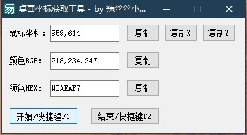 软件由易语言开发,使用起来非常简单,快捷键F1开始,F2结束,鼠标放置位置所显示的坐标既是该处的坐标,软件可用于软件开发、游戏制作等。