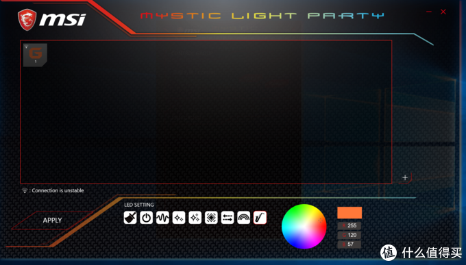微星Mystic Light设置很简单,默认就能自动识别支持RGB同步的硬件,上面主板、显卡、内存、键鼠都识别出来了。剩下自己调颜色就可以了,基本会用美图秀秀的都会用这个。
