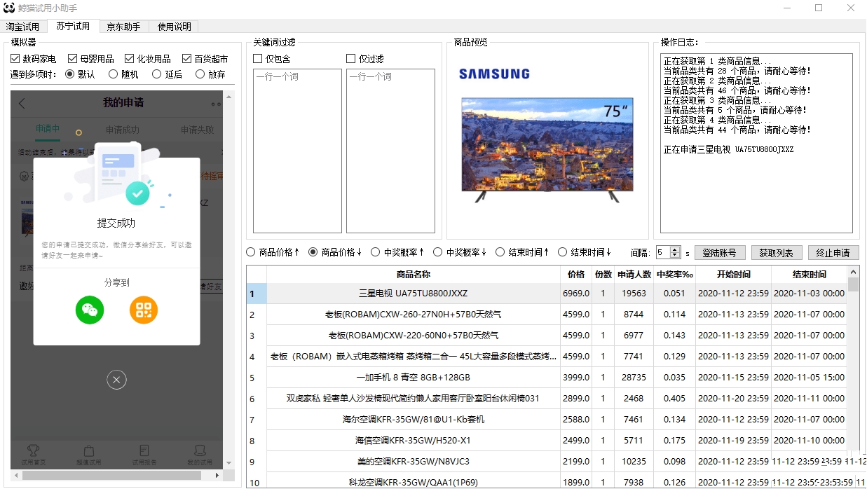 鲸猫试用小助手PC可以帮助用户领取到购物平台的试用资质,支持苏宁、京东、淘宝等多种网络购物平台,软件非常强大,用户登录之后即可自动获取试用选项,让用户对试用商品一目了然,非常方便点击申请提交数据,操作简单非常方便,让用户免费试用需要的商品!
