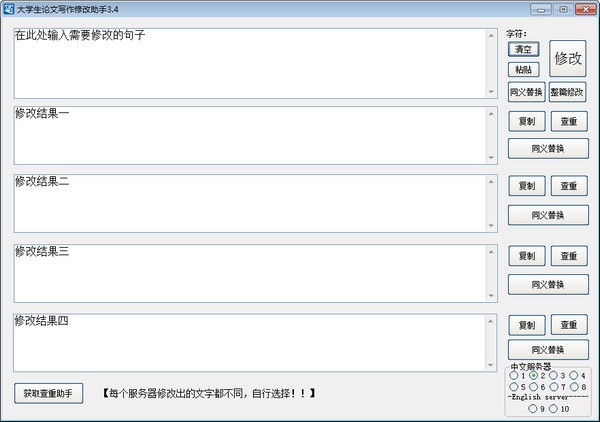 大学生论文写作修改助手适用于广大需要写毕业论文的同学们,能够替代人工将重复原句改头换面,对每段话进行降重处理,帮助您有效解决论文重复率过高的问题,而且内置了中、英文服务器,单个服务器修改出的文字不同,可以自行选择哦,支持免费试用,赶紧来试试吧!