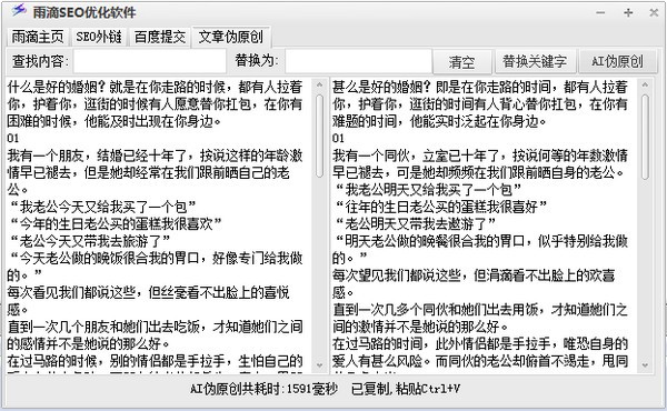 雨滴SEO优化软件,非常多的人都在使用人用的一款非常多的人都在使用小站长都在使用的SEO优化工具,界面简单,功能明了,新手即用即会,支持定时每几个小时发布一次SEO外链或者自动向百度提交链接,还可以将文章AI伪原创与关键字替换,非常好用,对于需要优化SEO的站长们来说是一个十分非常实用的利器~