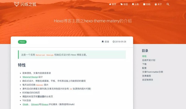 hexo-theme-matery 采用了响应式设计,能够将用户的博客很好地展现出来,支持多种设备,包括电脑、平板和手机等,通过这款软件展现的博客非常的简洁美观,支持自动切换banner 图片,包含多项清晰的分类,让用户对博客一目了然。