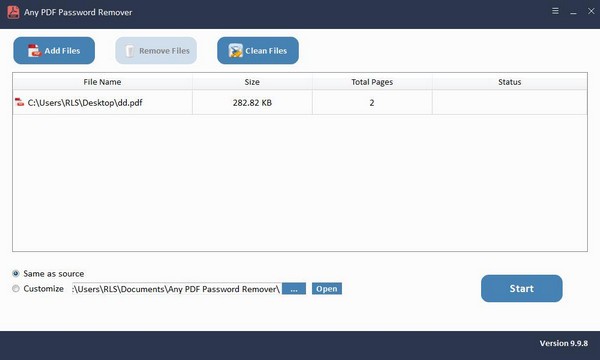 点击“开始”按钮,在几秒钟内删除PDF密码。