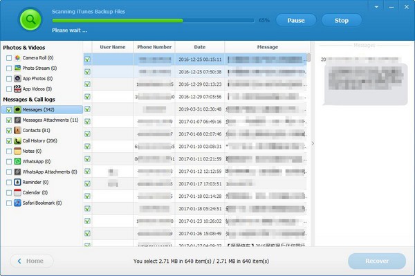 您可以从iTunes备份中检索所有数据,包括相机胶卷,照片Steam,App照片,App视频,消息附件,联系人,通话记录,便笺日历,提醒和Safari书签。