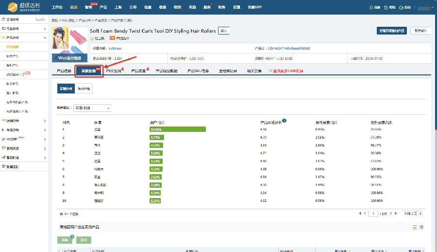 2.数据模块,Wish数据新增买家画像功能,分析产品的买家性别、年龄、国家属性