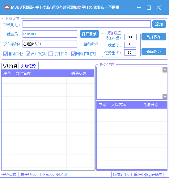 M3U8下载工具顾名思义就是专门针对M3u8 Downloader的文件下载工具啦,软件采用全新的设计,帮助用户下载大容量的文件速度更快,再也不用花费一两个小时了,还支持批量下载,同时下载多个任务,任务栏图标可显示下载进度,需要的话就快来下载试用吧~
