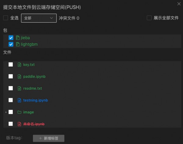 此外,BML CodeLab 支持对代码、数据、模型等类型文件的版本控制;可通过不同文件颜色区分新建文件、已删除文件、已修改文件,非常方便用户监控文件变化,把控版本生成。