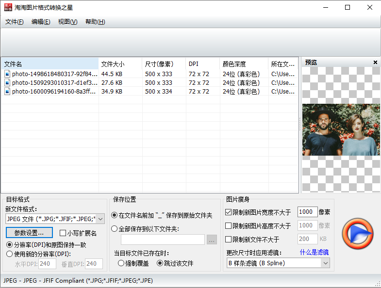 欢迎使用淘淘图片格式转换之星,非常多的人都在使用人用的一款上手容易、功能强大的图片格式转换工具,支持几乎所有格式的图片,采用最先进的编解码技术,不仅转换速度快,而且转换之后的图片质量也非常好,还支持批量转换,可以分别设置限制目标图片的宽度、高度、文件大小,非常非常方便,需要的话就来下载吧~
