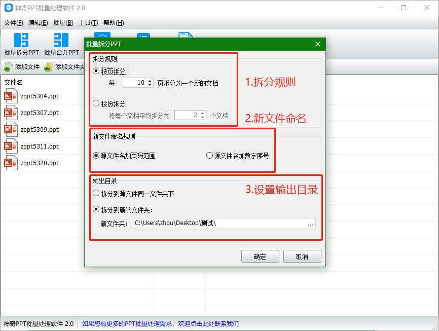 导入PPT文件后,点击“批量拆分PPT”按钮,设置拆分规则、新文件命名规则、输出目录,点击确定即开始批量处理PPT文件,如下图所示: