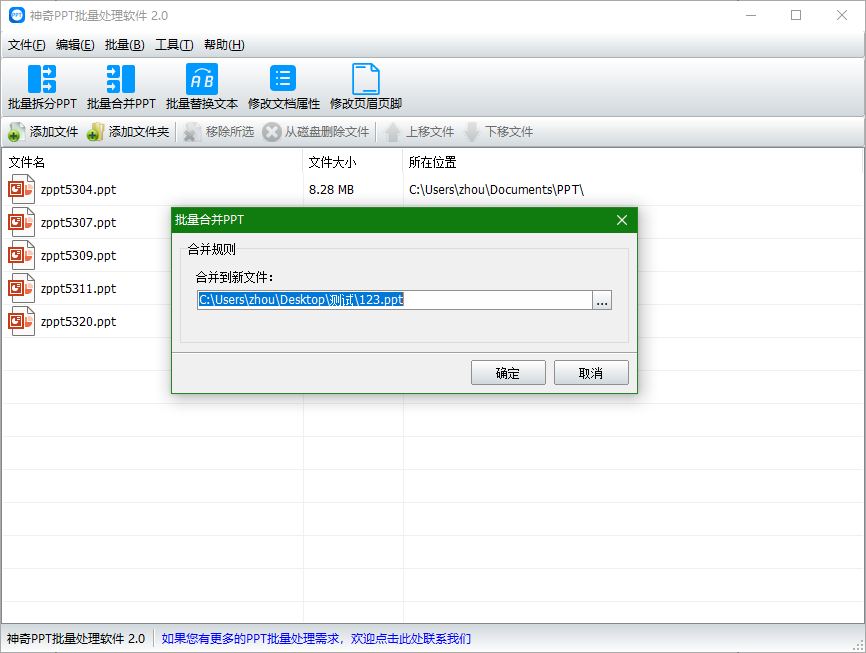 导入PPT文件后,点击“批量合并PPT”按钮,设置合并后的新文件保存目录,点击确定即开始批量处理PPT文件,如下图所示: