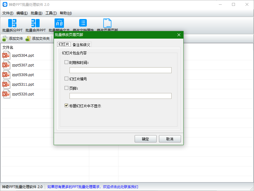 导入PPT文件后,点击“修改页眉页脚”按钮,设置页眉页脚内容,点击确定即开始批量处理PPT文件,如下图所示: