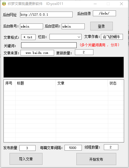 织梦文章批量更新软件适用于织梦网站的站长用户,能够帮助用户自动更新网站上面的文章,站长往往需要在网站中大量更新文章以保证网站的点击量,有时需要大量的时间去更新非常浪费时间,通过这款软件能够快速批量更新,提升了发文章的效率,非常便捷非常实用!
