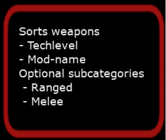 环世界武器分类器v1.2MOD是小编专门为喜欢环世界的小伙伴们准备的,这是一个非常非常实用的功能型mod,可以帮助玩家将游戏中的各种武器进行分类,环世界中有非常多的人都在使用武器找起来很麻烦,现在分类之后玩家可以直观地看到自己的武器装备了,更好地进行管理。