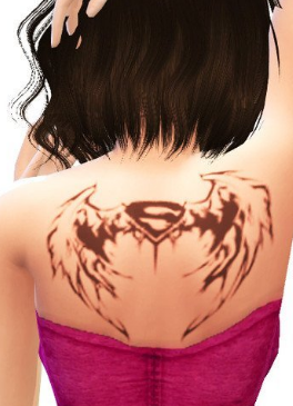 模拟人生4超人羽翼纹身MOD,作者专为游戏中的女性角色制作的一个纹身类补丁,使用后就可以为角色替换上如下文图示一样的纹身了,图案十分帅气,中间是一个超人的标志,还有一双翅膀,前后都可以用,非常好看,喜欢的玩家可以下载后按照下文教程操作使用哦!