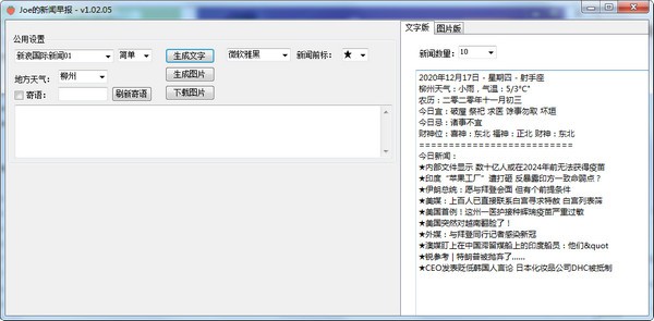 Joe的新闻早报,一个可以帮助您快速生成每日晨报的软件,它能够每天抓取新浪的几个板块的最新时事热点资讯完整的标题,还有部分城市的天气,您也可以自己填写寄语部分,支持生成文字版以及图片版,还支持放上二维码或者公司LOGO之类的标志,非常非常方便。