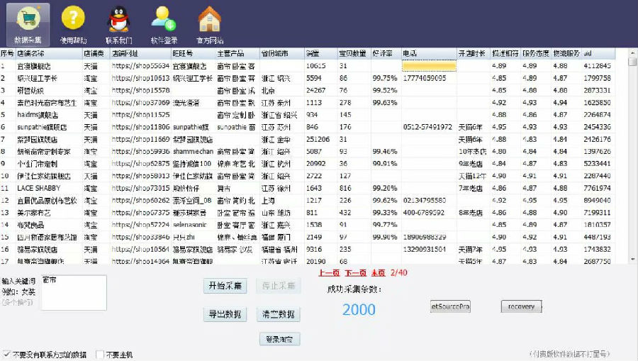01、爱采集淘宝天猫采集大师,一键采集淘宝 天猫,指定关键词的商家信息,包括名称、地址、电话号码、质量高,采用大数据等技术,快速帮助你采集到全国各地 各行业的精准人脉圈 商业圈。