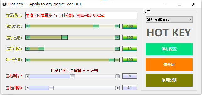 Hot Key万能血雾压枪非常适合喜欢枪战类型游戏的玩家们使用,能够帮助玩家更好地进行压枪,从而可以打得更加精准,工具包含找色追踪+压枪功能,支持所有的FPS游戏,使用这款工具之后玩家在对拼时就能打出更强的伤害攻击了,如果觉得不舒服还可以手动调整参数。