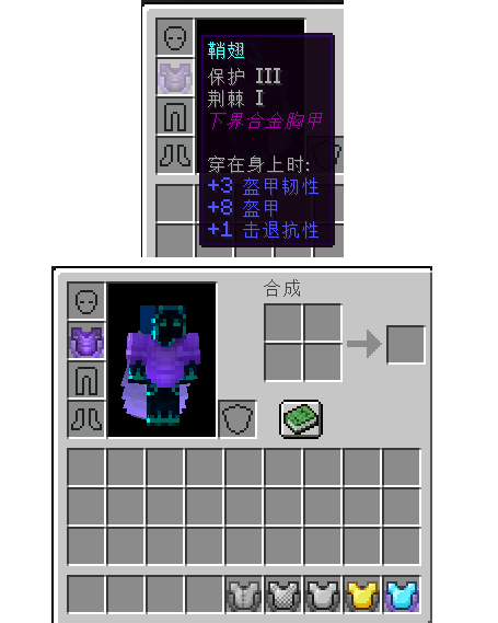 合成后的鞘翅胸甲的附魔为合成前胸甲的附魔,其提供的护甲、护甲韧性、击退抗性与胸甲一致