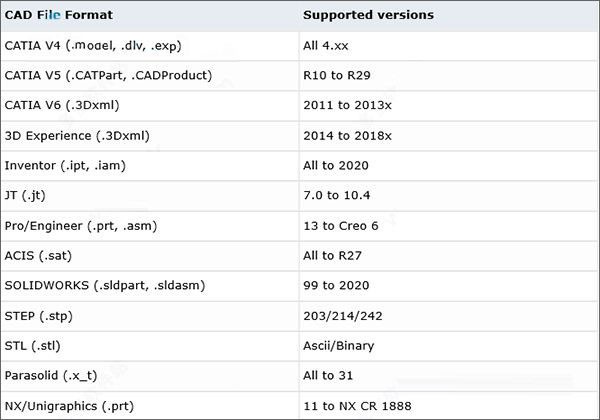 支持的CAD格式列表已更新。 JT文件支持已扩展到10。4版。 其他更新包括SOLIDWORKS 2020,Inventor 2020和NX CR版本1888。受支持的格式和版本的完整列表如下: