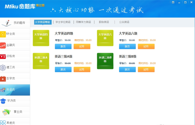 Mtiku命题库保过版涵盖了超多热门考证专业的历年考试真题,是非常多的人都在使用人用的一款真正站在考证考生角度打造的题库软件,教师、金融、财会、工程、医学、考研、公务员、司法等题库都囊括其中,命题库试题全面、内容精编、解析详尽,开启全方位系统化学习,让您快速掌握知识点,让考试更加单。