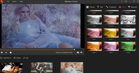 2.选择您喜欢的主题,添加元素,文本,选择过渡效果和过滤器。