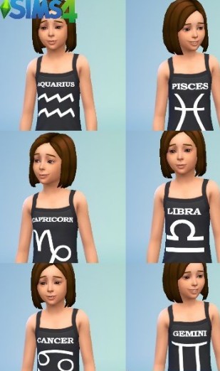 每个星座都有单独的图标符号,十二星座有十二个,作者就是以这个为灵感制作了模拟人生4女孩十二生肖背心MOD,使用后可以在游戏中为小女孩穿上一件如下图所示一样的星座图案吊带背心,设计的十分简约,无论是单穿还是当做内搭都非常好看,喜欢的玩家可以入手哦!