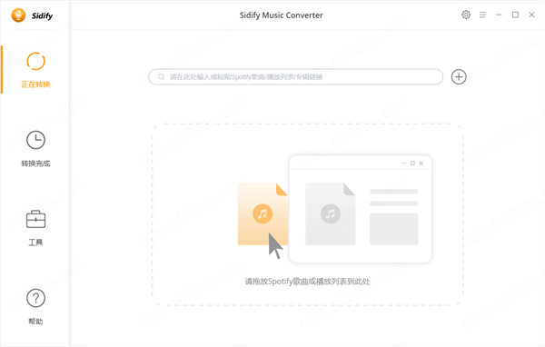 第2步、单击“ 添加音乐按钮”以打开弹出窗口,该弹出窗口指示您将歌曲或播放列表拖放到此处。或者,您可以通过将播放列表或歌曲的链接复制到剪贴板来添加音乐。打开Spotify应用程序,检查您想要转换的歌曲或播放列表,然后将它们拖动到软件添加窗口。