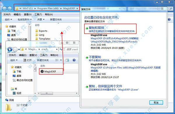 2、进入软件安装路径,然后打开注册机数据包文件夹,进入crack文件内,将exe程序复制到软件安装路径下替换源文件,选择复制和替换即可激活软件