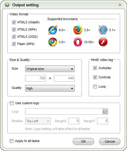 导入视频文件后,单击“更多信息...”按钮可自定义输出设置,如视频格式、大小、质量、htl5视频标签等。如果您想要相同的输出设置,只需选中“应用于所有任务”。