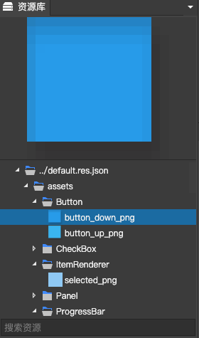 通过 资源库面板 ,可以将资源素材拖拽到 UI 场景中去。通过下方的 搜索资源 框,输入文件名,可以快速查找资源