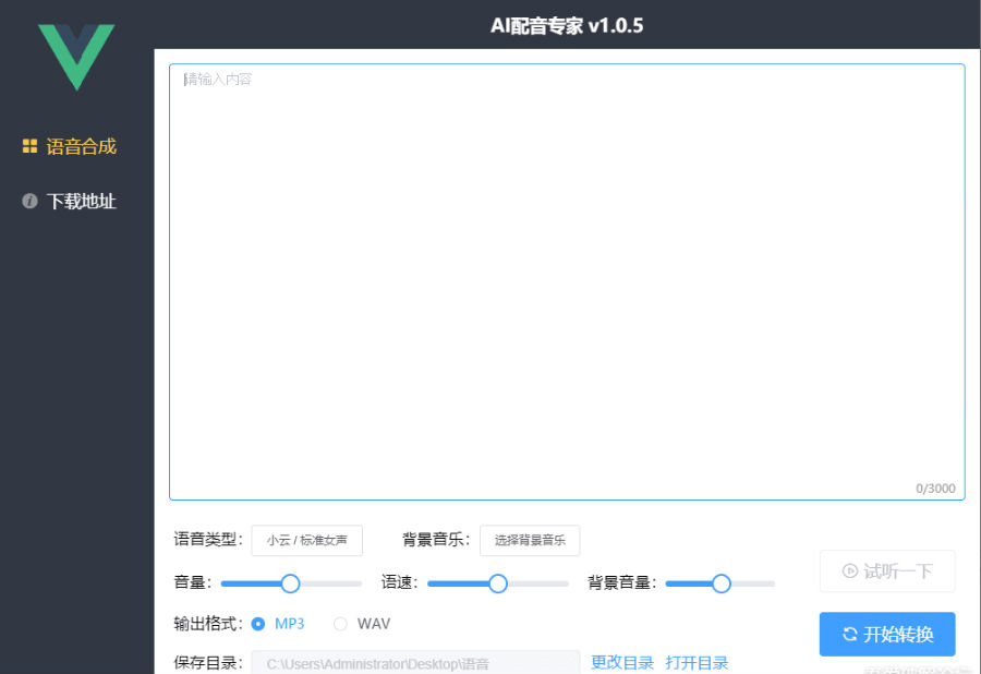 AI配音专家是由论坛大神原创制作,为用户提供文字转语音的功能,能够帮助用户将所需的文字转换为语音朗读效果,软件功能强大,包含多种不同的声音,用户可以根据需求选择声音效果,采用阿里语音合成引擎,支持Windows设备,完全免费提供给用户使用,非常非常方便非常实用。