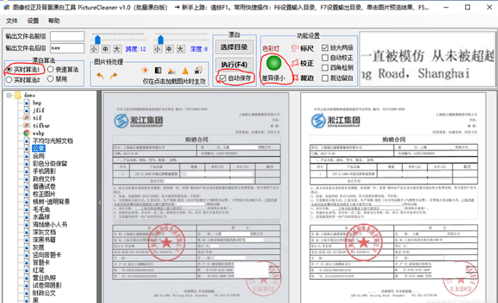 4、支持三种漂白算法,两种漂白方式。漂白速度在几十毫秒~几秒之间。支持保留色彩,可以保留公章或试卷红/蓝笔颜色。