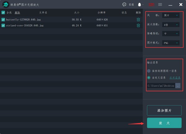 2.照片添加完成,设置放大后的参数和保存地址。参数中风格选择照片,其他根据需要设置即可。接着点击“放大”按钮,软件开始运行。