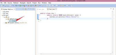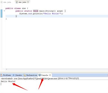 左键点击左边的one.java。Run as>1 Java Application,程序就开始运行了。
