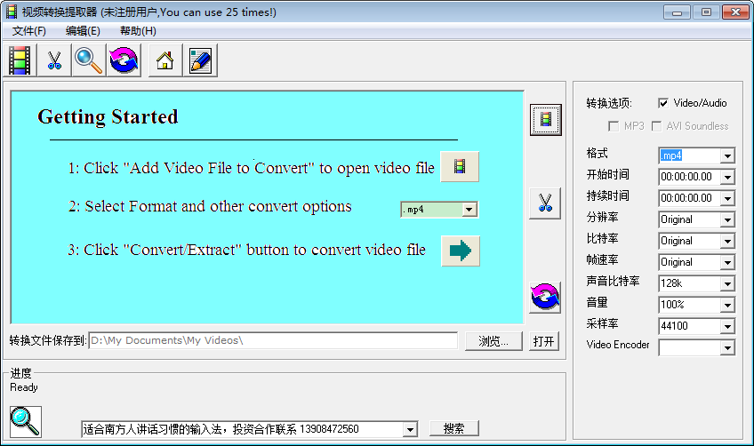 视频转换提取器主要为用户提供了视频格式转换及音频提取功能,您可以利用这款软件将FLV视频中的音频单独提取为 MP3 格式的音频文件,还可将多种视频文件格式进行相互转换,可自定义帧速率、分辨率等参数,未注册版本可使用 25 次,而且软件不包含任何广告和插件,您尽可放心使用。